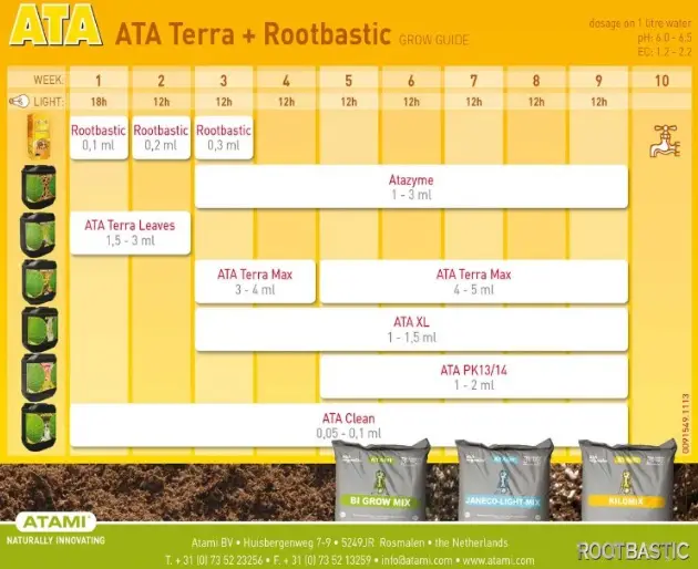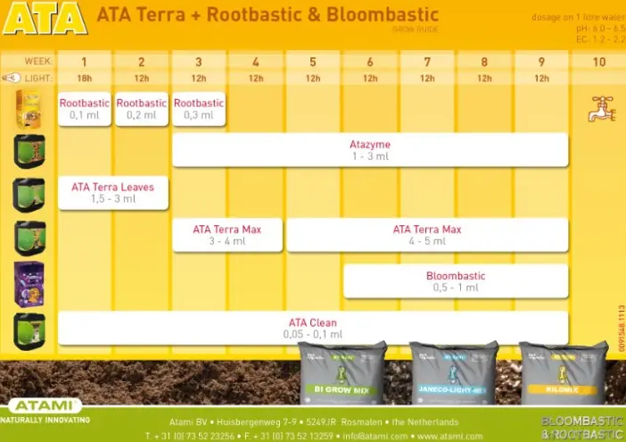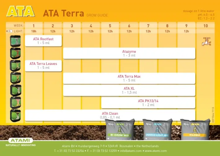 La tabla de cultivo ATA Terra está diseñada para usar durante todas las etapas del cultivo en tierra, combinando distintos productos según la fase: